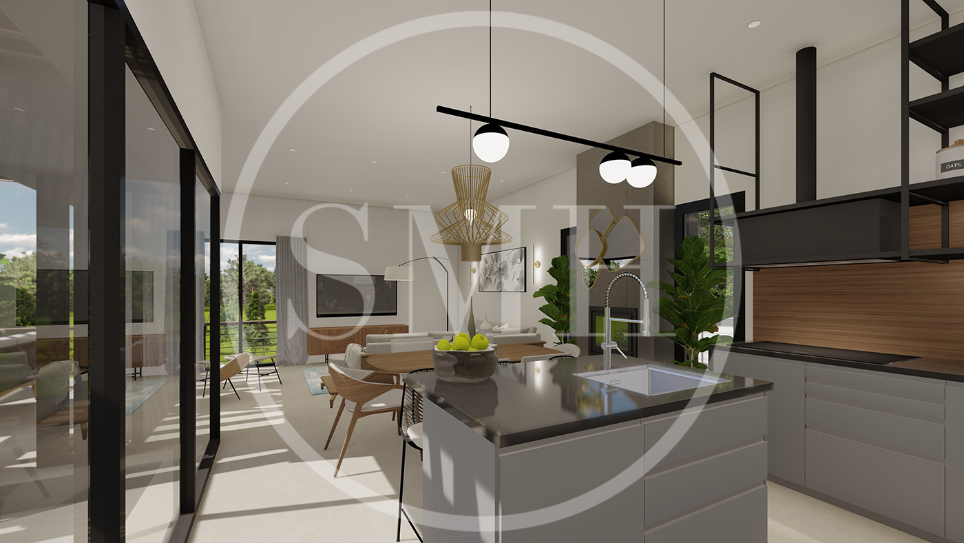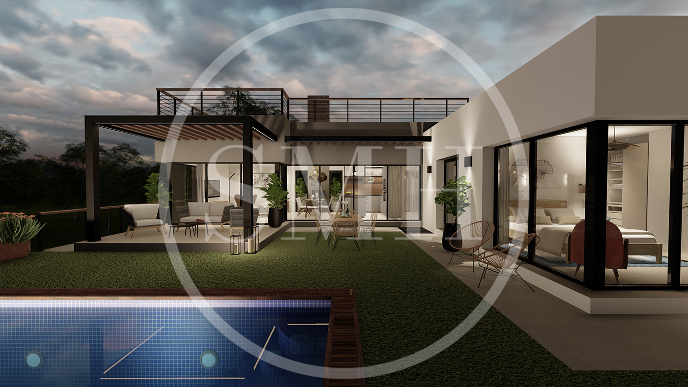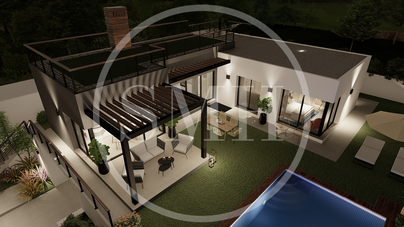 On the main floor, you’ll find the living and dining area with an open-plan kitchen (yet to be chosen). From here, there’s direct access to a spacious covered and uncovered terrace, an exquisite garden, and a private pool. Additionally, this floor houses the en-suite master bedroom with a walk-in closet and terrace access, as well as two guest bedrooms sharing a bathroom and a guest toilet.