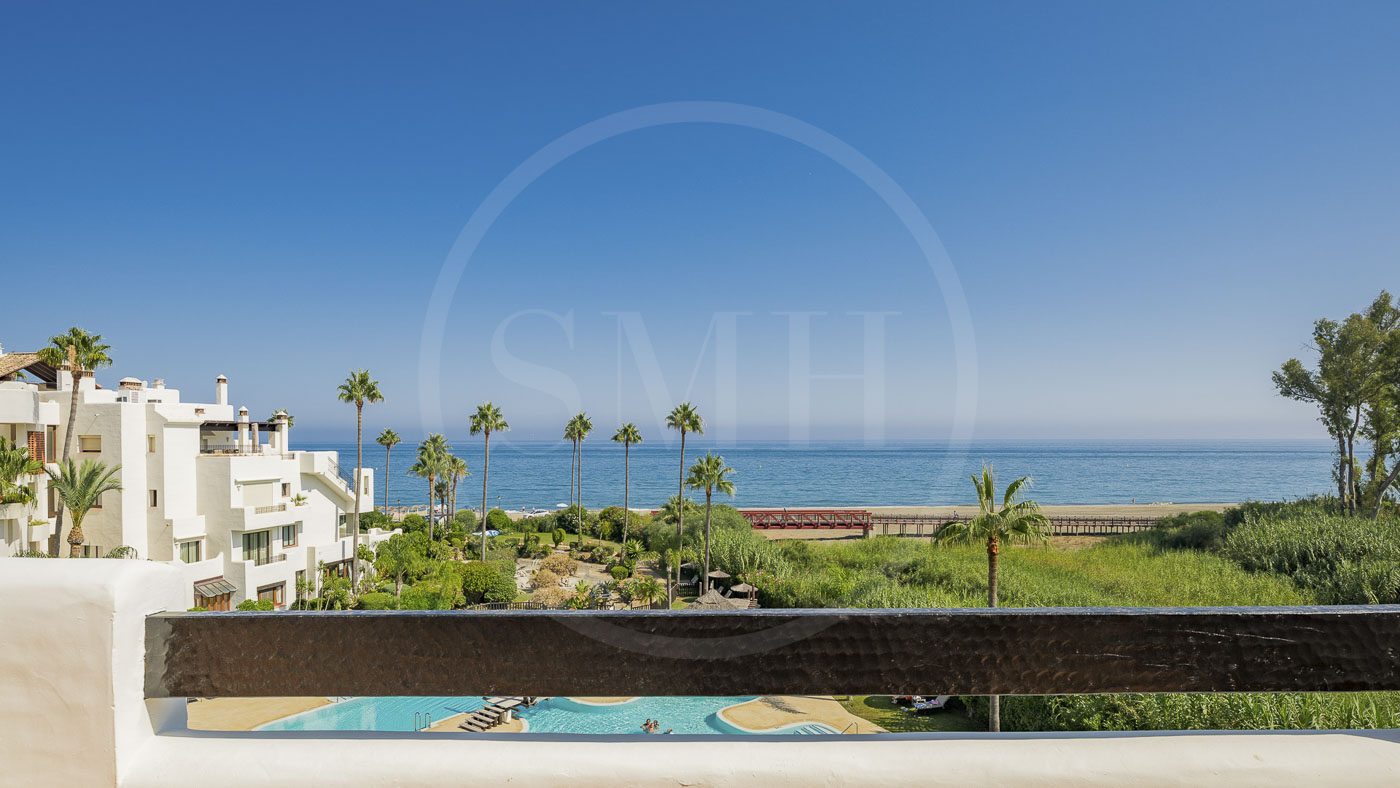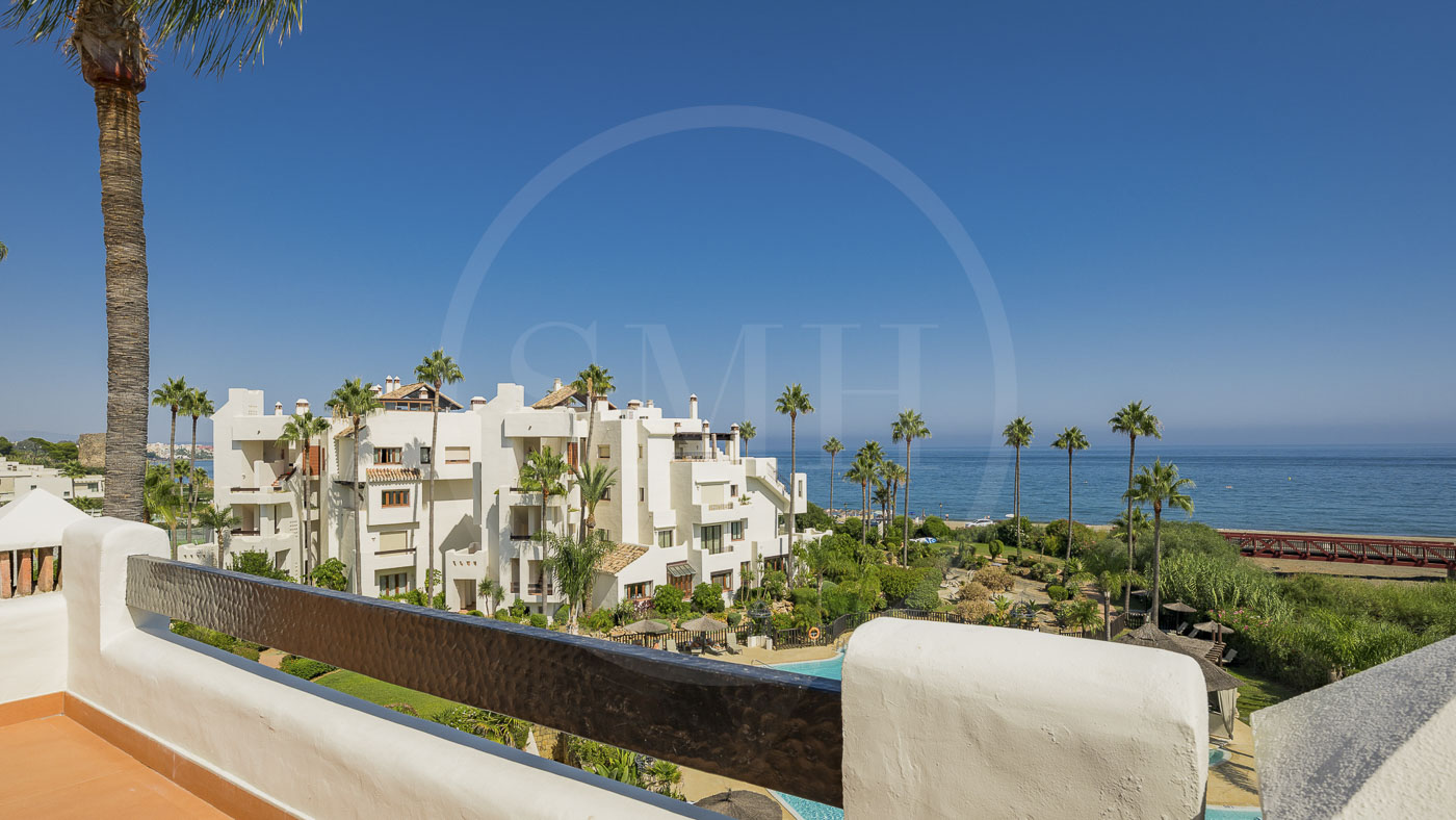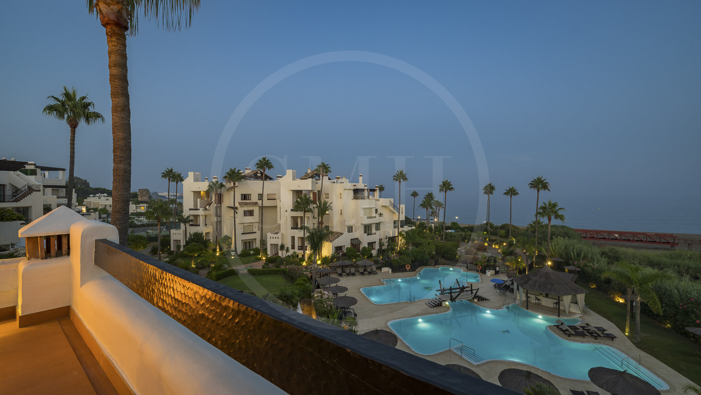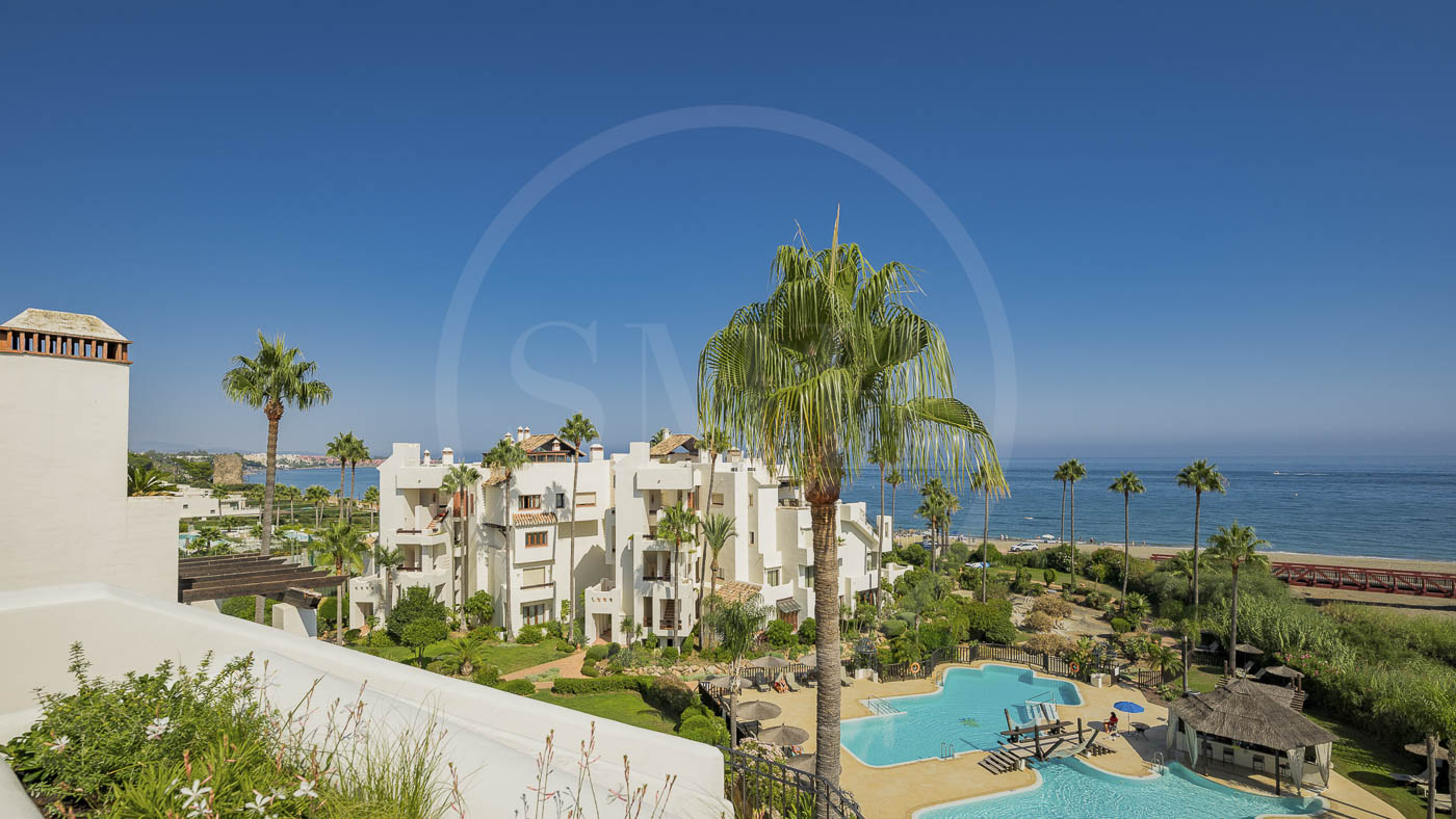Bahía del Velerín is a luxurious community between Marbella and Estepona. It has a fantastic pool area with a snack bar, tropical gardens and 24/7 security. The community is located at one of the best beaches in the area. The apartment comes with an underground parking space and an additional storage room in the basement.